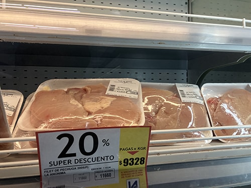 鶏のムネ肉1kg、皮なしAR$11.660(約1,238円)